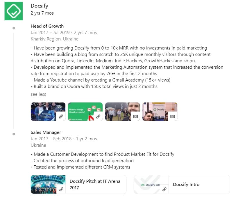6. So, if done right, your job promotion should appear under the same company listing in your profile but as a different position. So, something like this, as an example: