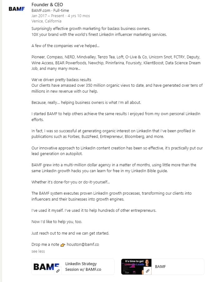 So, if the goal of your LinkedIn profile is for you to connect with marketing startup owners (let’s say they are your ideal clients), you should write for them in mind.