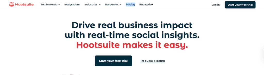 | Hootsuite | Social media listening and monitoring | Social listeningSocial media analyticsPublishing feature | Offers free trial; paid plan starts at $149 per month. |