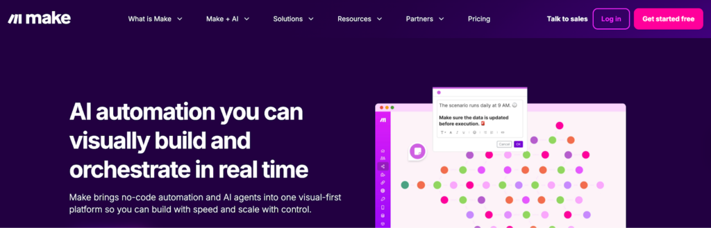 | Make | Streamlined workflow | Sales automation Agentic automation integrations | Free trial available; paid plan starts at $10.59 per month. |
