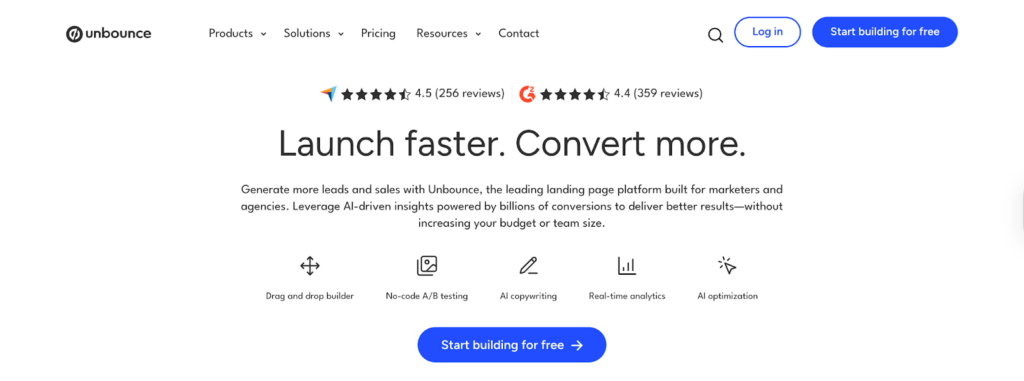 Unbounce starts at $39/mo and includes unlimited landing pages, pop-ups, sticky bars, and AI copywriting for one domain.