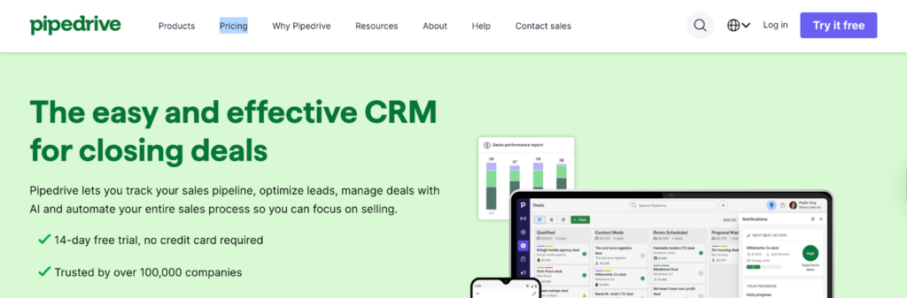 | Pipedrive | Visual sales pipelineMultichannel outreachReporting and analytics | Free trial available; paid plans start at $14 per month |