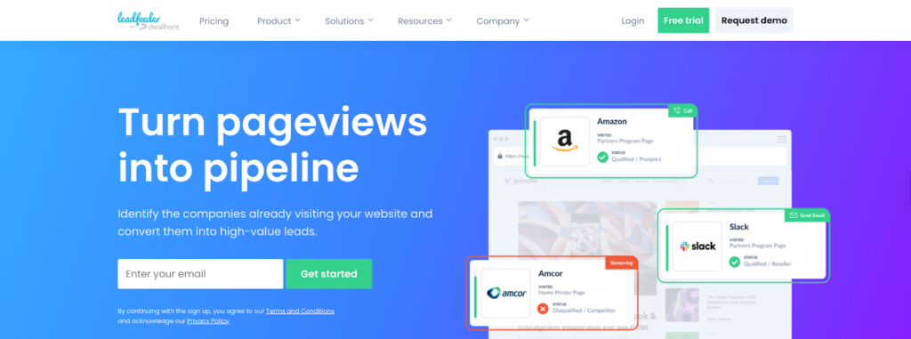 | Leadfeeder | Web visitor identificationIntegrations | Free trial available; paid plan starts at $150 per month. |