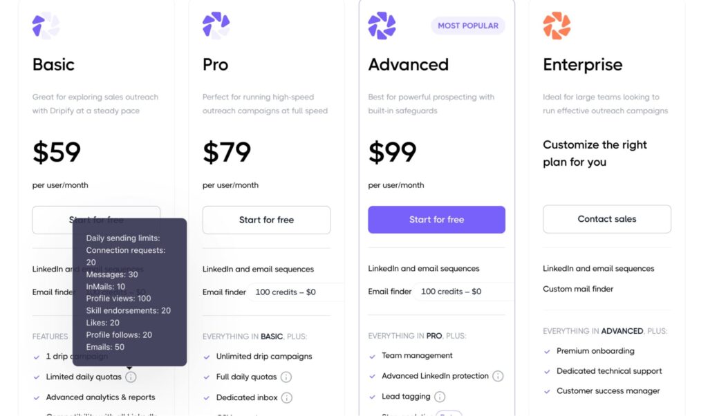 Basic ($59/mo) is limited, while Pro/Advanced ($79/mo and $99/mo) unlock full quotas, which matters when teams need tighter control over outreach volume and risk.