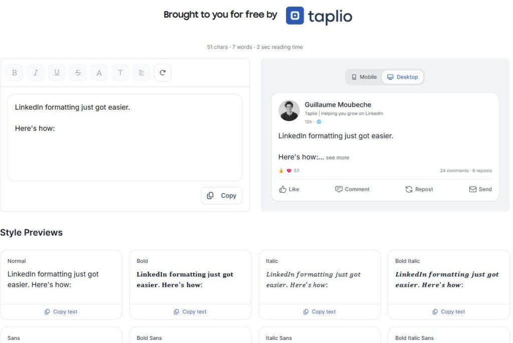 Taplio formatter works almost the same way as the previous LinkedIn text formatter tools. Paste your text, pick a style, and preview how it’ll look before posting.