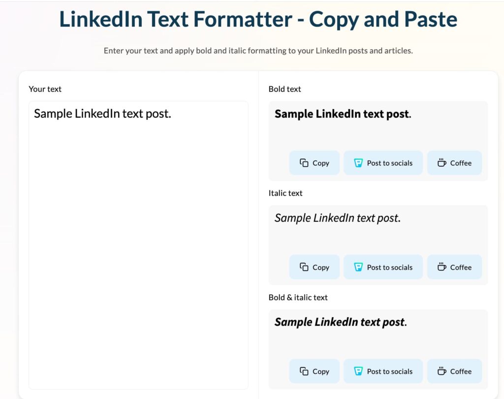 LinkedIn doesn’t support bold or italic text natively. So, you’ll need an external formatter.