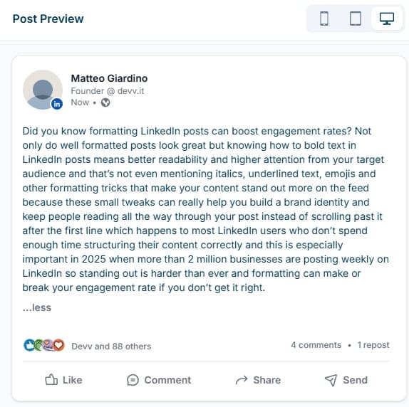 The built-in post preview tool is especially useful because it shows exactly where your text will get cut off under the “see more” line on LinkedIn. This means you can adjust your hook, spacing, or sentence length to optimize for clicks and keep the readers curious to expand the post.