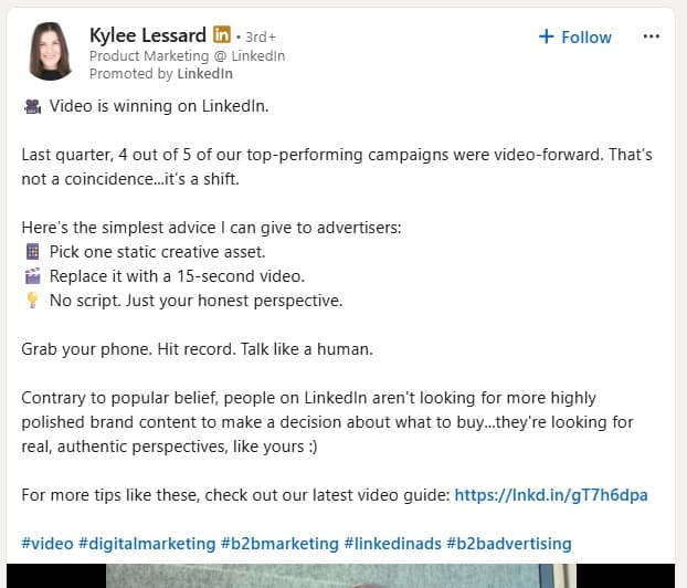 Videos uploaded directly to LinkedIn (not embedded). These autoplay in feeds and perform best between 30-60 seconds.