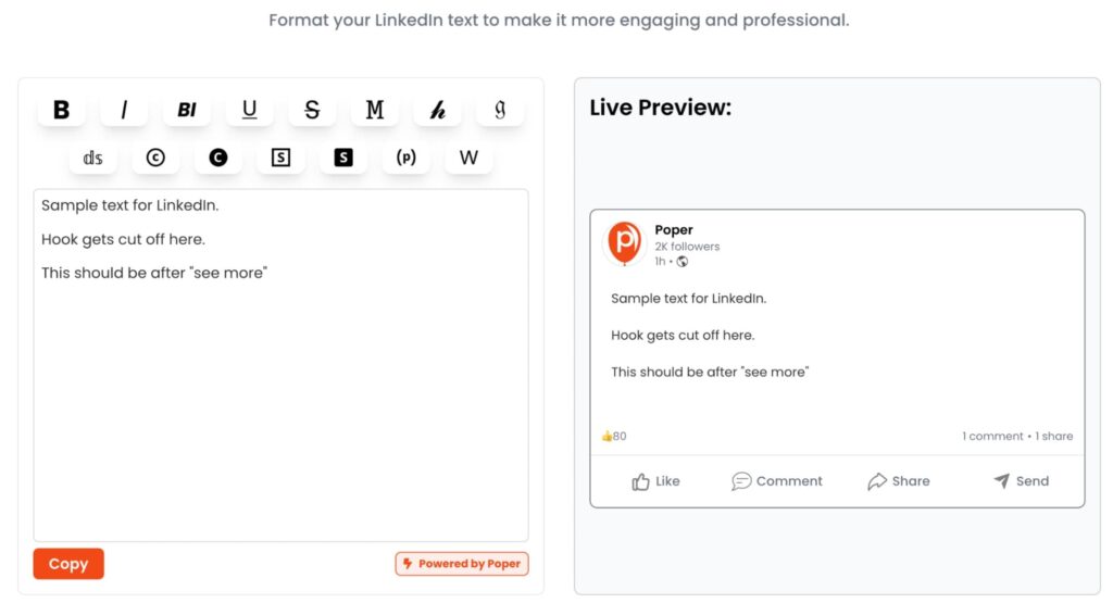 Poper offers all the essential LinkedIn text formatter options – bold, italics, underline, and strikethrough. As well as decorative ones you’ll probably never use (gothic fonts, circled letters, squared text).