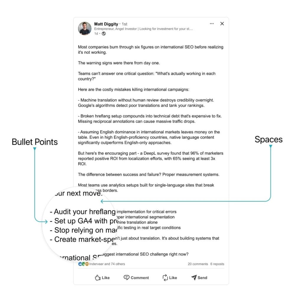 Non-native fonts (e.g. circled text) can hurt accessibility and visibility. Stick to 1-2 formatting types per post max. Clean, well-structured posts are easier to read and more likely to keep users reading all the way through.