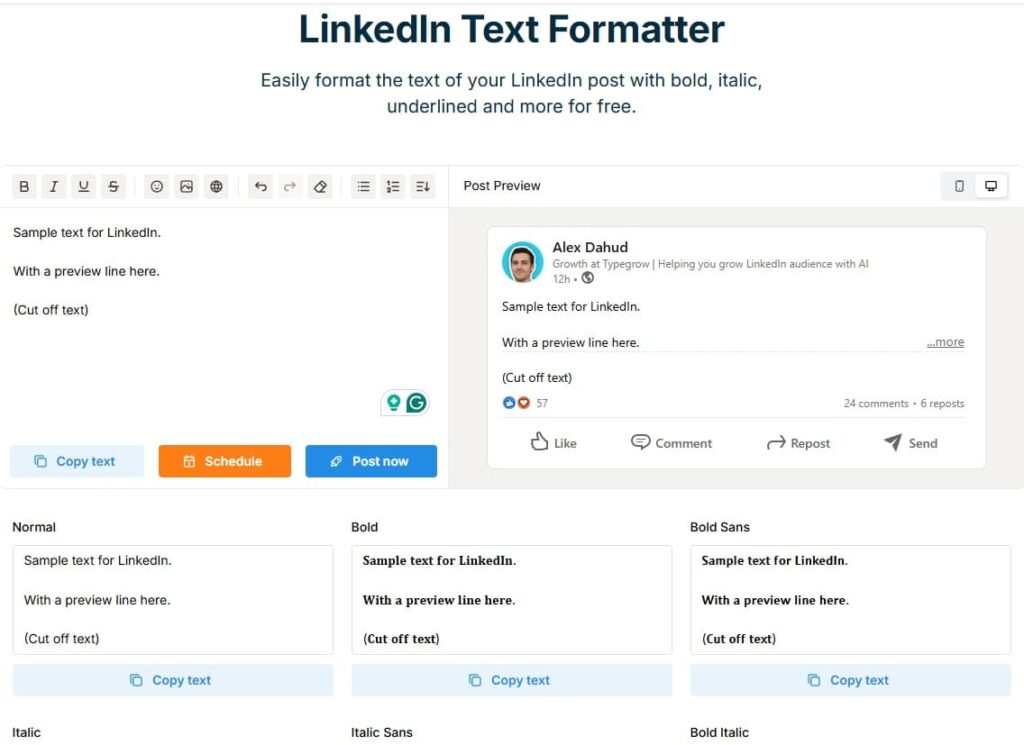 Typegrow’s LinkedIn text formatter is also straightforward. Paste your text, choose your style, and preview exactly how it’ll look on LinkedIn before posting.