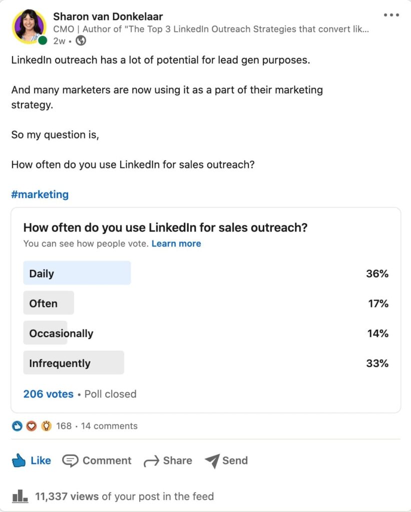 Quick surveys with up to four options to collect feedback or opinions. Keep your LinkedIn polls short, relevant, and actionable.