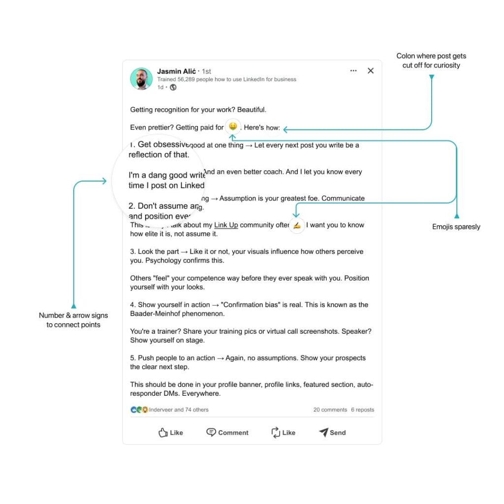 Whether it’s bolding a key phrase, adding white space, or using emojis… Small visual tweaks can make your post 10x easier to follow (and way more likely to be read all the way through).