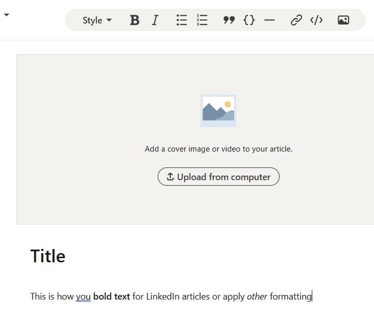 The “write article” feature on LinkedIn is one of the few native ways on how to bold in LinkedIn post content properly. Since it supports formatting like bold, italics, and headings.