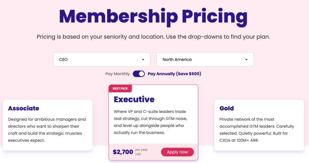 Pavilion’s Executive tier is $2,700 a year. Its top Gold tier is invitation-only and built for CXOs at 100M+ ARR companies, with undisclosed pricing.