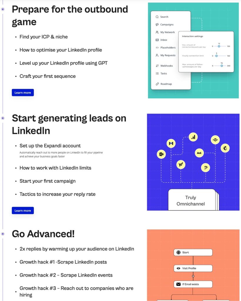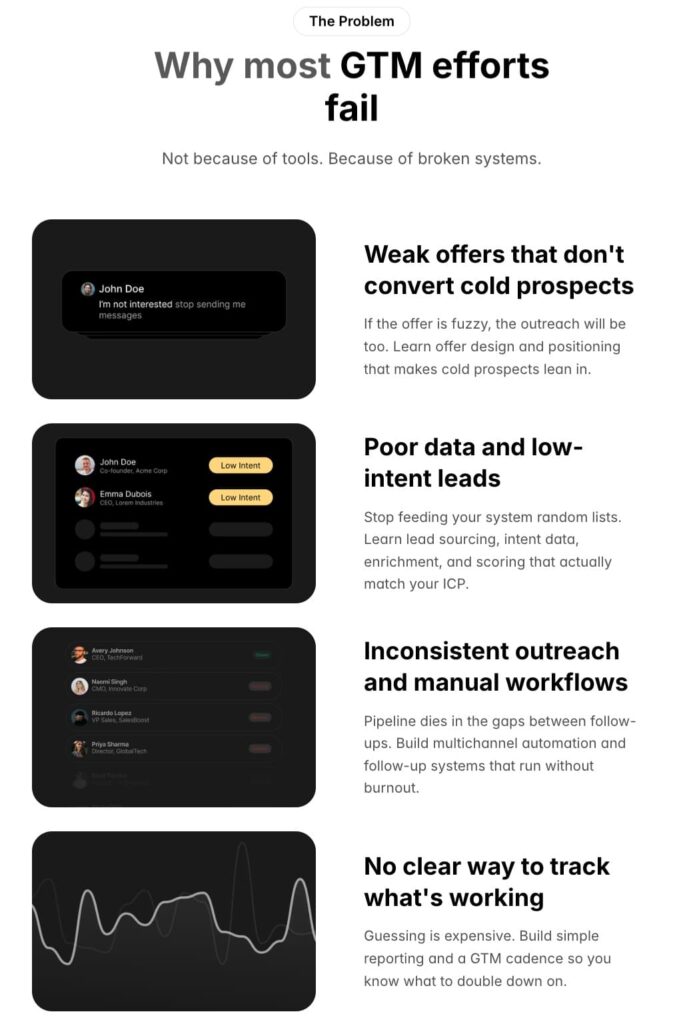 Copy-paste sequences and “proven” templates don’t work in real outbound because your ICP is different. What you get instead is a solid framework you can customize, which is the angle we teach. The outreach modules are built around signal-based triggers — the approach Expandi is built on — so the tactics connect directly to how the platform works if you choose to run sequences live.