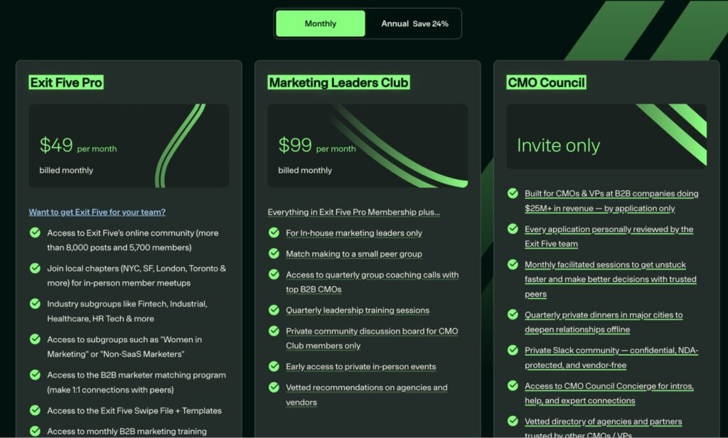 Exit Five charges $49 a month for standard access and $99 a month for the Marketing Leaders Club, so $588 to $1,188 a year. For those fees, the deliverables are broadly the same across providers: a private forum, member events, a jobs board, and an educational library that most members remember exists twice a year.