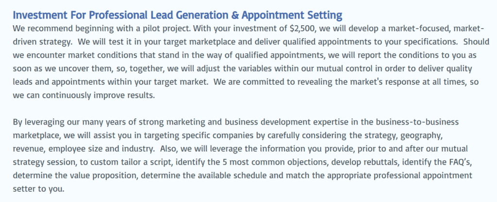 This is because pricing can be a huge competitive advantage for many lead generation agencies. And very few of them want to expose their margins, methods, or exact pricing models…