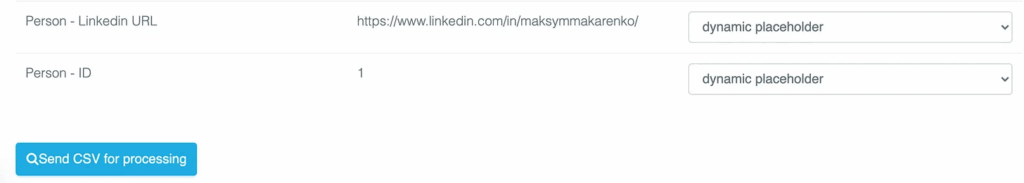 • When importing the CSV file to your Expandi account, map fields and make sure to select “Dynamic placeholder” to the right of “Person – ID.” This allows Expandi to send custom fields to Make by using a webhook.
