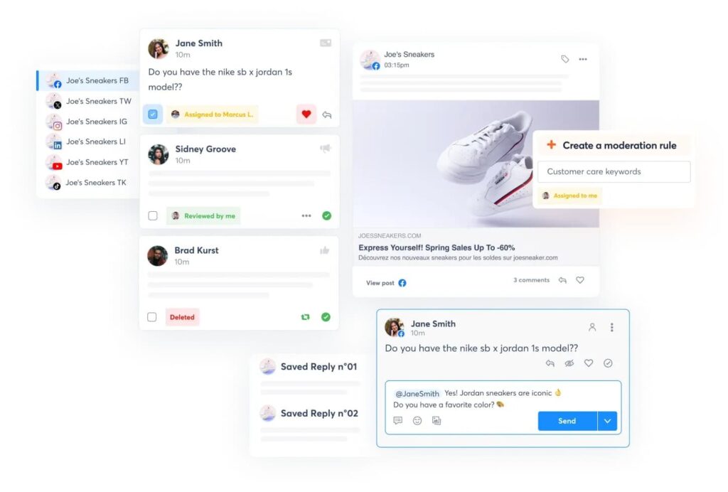 - Inbox management – consolidates messages, comments, and mentions from all connected platforms into one view with labels, saved replies, and moderation rules. For high-volume teams, handling everything centrally cuts response time significantly.