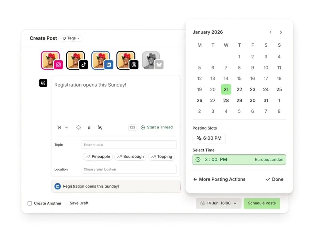 - Multi-platform scheduling – covers Facebook, Instagram, TikTok, LinkedIn, X, Pinterest, YouTube, Google Business, and more. Posts can be scheduled individually or queued in a recurring schedule.