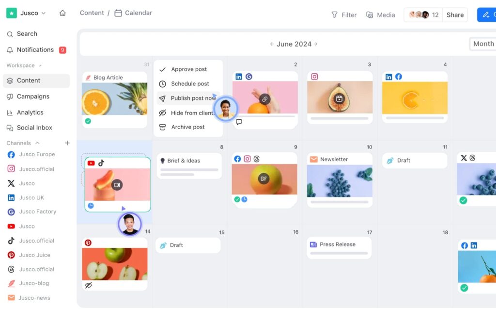 - Approval workflows – content moves through structured review before publishing, with internal comments and shared calendar views keeping clients and teams aligned.