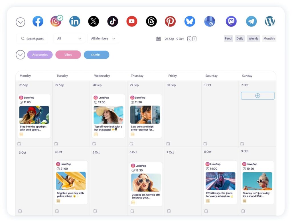 - Feed view – displays scheduled content in the order it will appear in each platform’s feed, allowing teams to assess content flow and visual consistency.