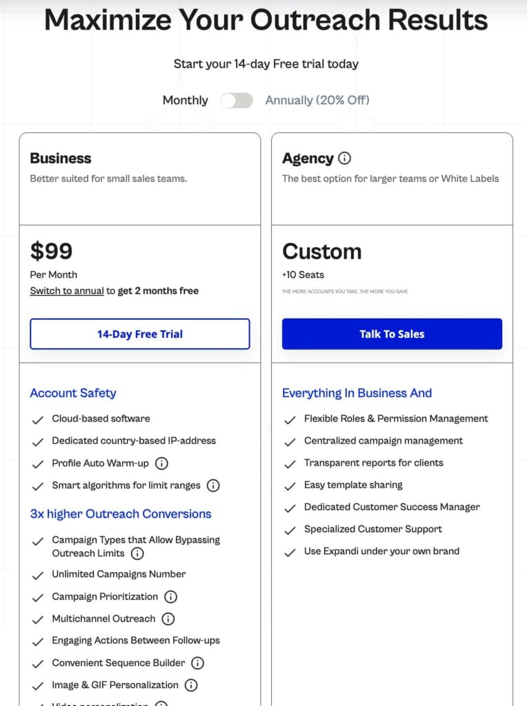 Compared to SocialPilot’s content-scheduling model, Expandi’s pricing reflects a different value proposition. The main ROI metric here is meetings booked and pipeline created through LinkedIn outreach.